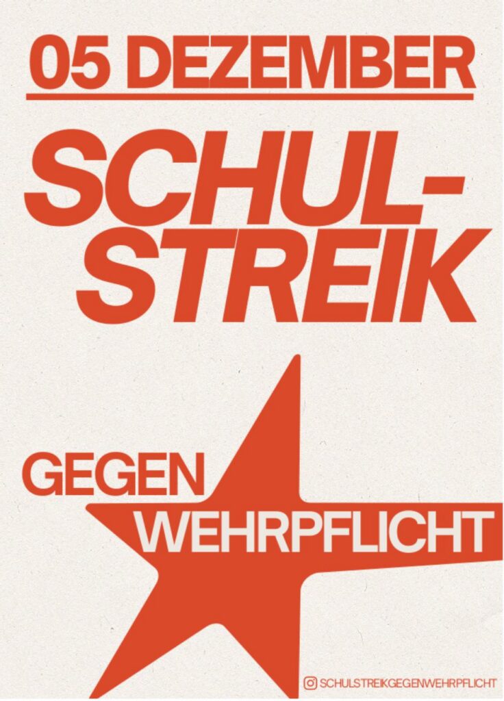 The nationwide initiative “School Strike Against Compulsory Military Service” is calling for a school strike throughout Germany this Friday. Over 90 strike committees are organizing demonstrations and rallies in various cities to send a clear message: We refuse to accept the planned reintroduction of compulsory military service, the militarization of society, and the logic of war!